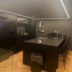 At the heart of the home is a striking modern black kitchen, with the walls and ceilings colour-washed in black to create a dramatic, designer feel. A glass-enclosed staircase adds a clean, open look, bringing in light and a modern edge to the traditional setting.